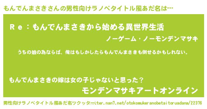 | 女子向けラノベタイトル風あだ名 | 『もんでんまさき伯爵の花嫁』 |