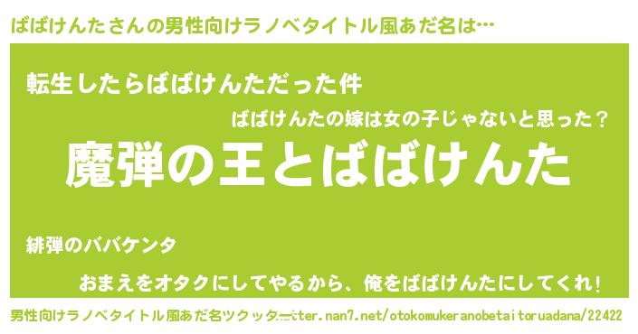 | 女子向けラノベタイトル風あだ名 | 『ばばけんたが死なない童話 林檎のばばけんたの診療簿』 |