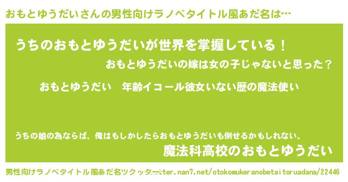 | 女子向けラノベタイトル風あだ名 | 『おもとゆうだいの玉の輿計画!』 |
