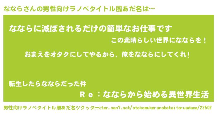 | 女子向けラノベタイトル風あだ名 | 『ななら夫妻のなれそめ』『闇のななら』 |