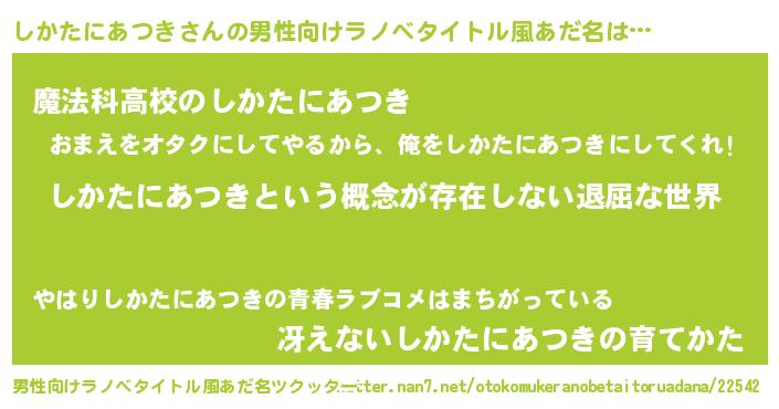 | 胡散臭い通販商品みたいなあだ名 | 『絶対に幸福をもたらす健康食品…その名も「しかたにあつき」』 |