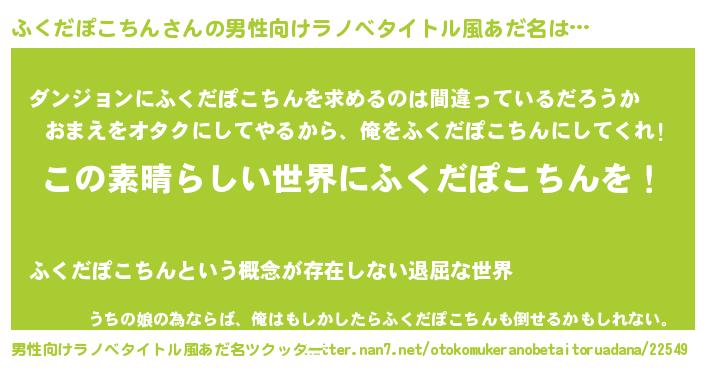 | 女子向けラノベタイトル風あだ名 | 『乙女ゲームの破滅フラグしかない悪役ふくだぽこちんに転生してしまった…』 |