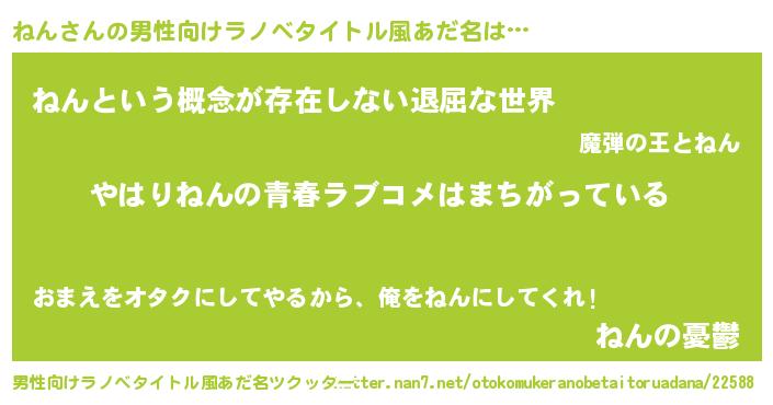 | 女子向けラノベタイトル風あだ名 | 『ねんの雑貨屋さん』『ねんの契約王妃』 |