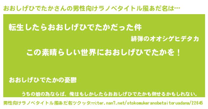 | 女子向けラノベタイトル風あだ名 | 『悪役おおしげひでたかに転生したようですが、知った事ではありません』 |