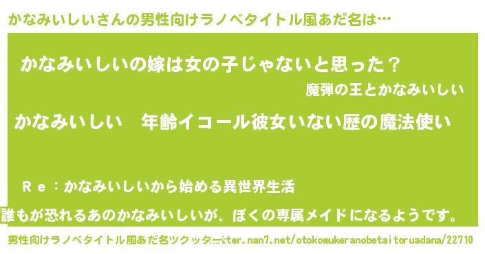 | 女子向けラノベタイトル風あだ名 | 『かなみいしいの玉の輿計画!』 |