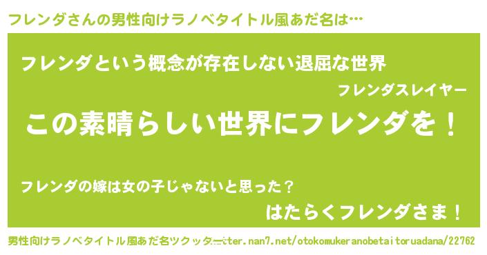| 女子向けラノベタイトル風あだ名 | 『悪役フレンダに転生したようですが、知った事ではありません』 |