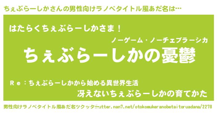 | 女子向けラノベタイトル風あだ名 | 『ちぇぶらーしか姫と円卓の騎士』 |
