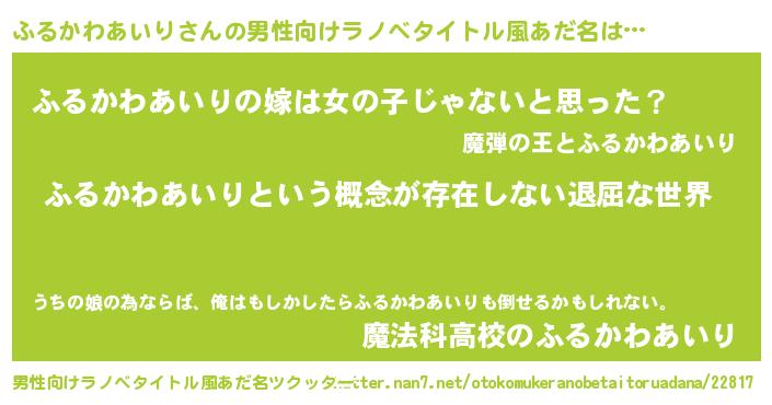 | 女子向けラノベタイトル風あだ名 | 『異世界で失敗しない100のふるかわあいり』 |