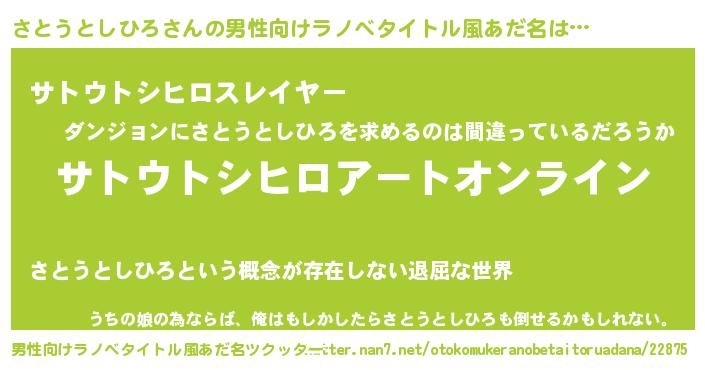 | 女子向けラノベタイトル風あだ名 | 『誰かこのさとうとしひろを説明してください! ~契約から始まるウェディング~』 |