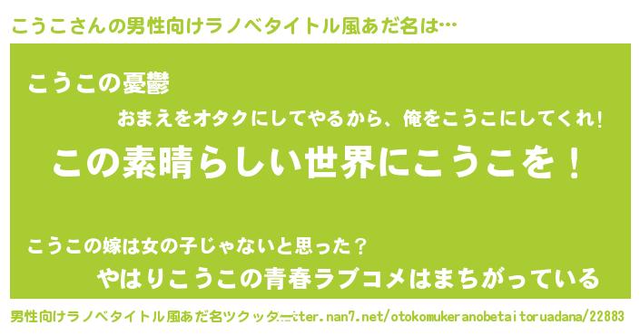 | 胡散臭い通販商品みたいなあだ名 | 『あなたにだけ特別に提供する限定10本のレアな日本酒…その名も「こうこ」』 |