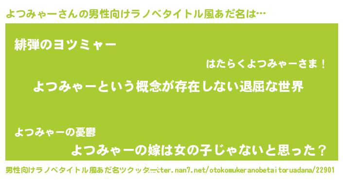 | 女子向けラノベタイトル風あだ名 | 『異世界で失敗しない100のよつみゃー』 |