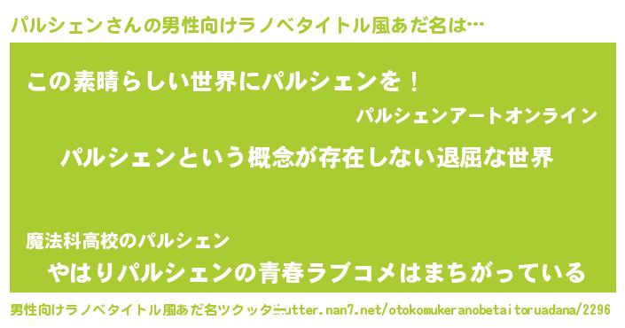 | 女子向けラノベタイトル風あだ名 | 『異世界で失敗しない100のパルシェン』 |