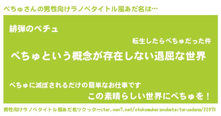 | 女子向けラノベタイトル風あだ名 | 『異世界で失敗しない100のぺちゅ』 |
