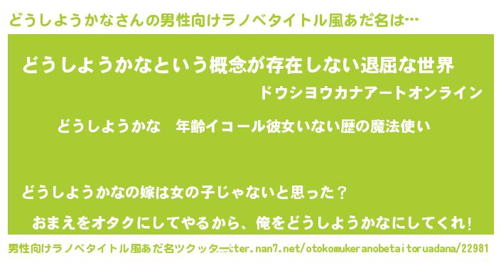 | 女子向けラノベタイトル風あだ名 | 『どうしようかなの玉の輿計画!』 |