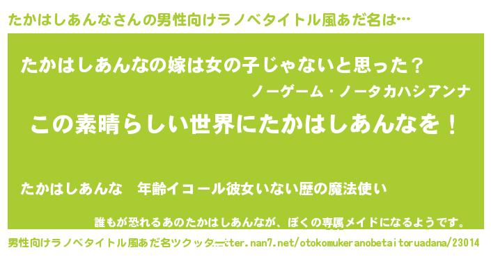 | 女子向けラノベタイトル風あだ名 | 『悪役たかはしあんなに転生したようですが、知った事ではありません』 |