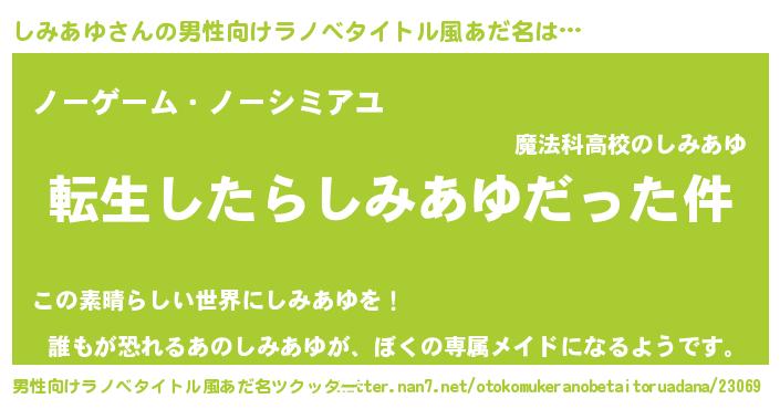 | 女子向けラノベタイトル風あだ名 | 『婚約破棄系悪役しみあゆに転生したので、保身に走りました。』 |