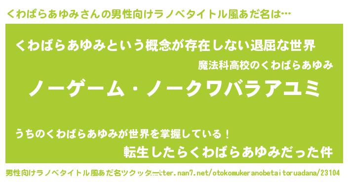 | 伝説のあだ名 | 『救世主となる錬金術士くわばらあゆみ』 |
