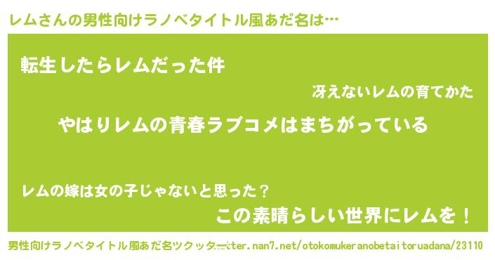 | 女子向けラノベタイトル風あだ名 | 『レムの雑貨屋さん』『レム様がみてる』 |