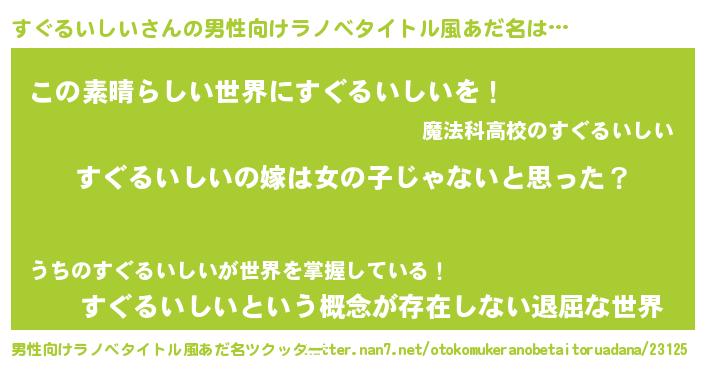 | 女子向けラノベタイトル風あだ名 | 『すぐるいしいの卵を拾いまして』 |