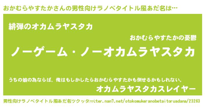 | 女子向けラノベタイトル風あだ名 | 『死神おかむらやすたかの再婚』 |