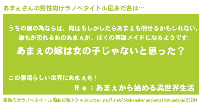 | 女子向けラノベタイトル風あだ名 | 『あまぇの卵を拾いまして』 |