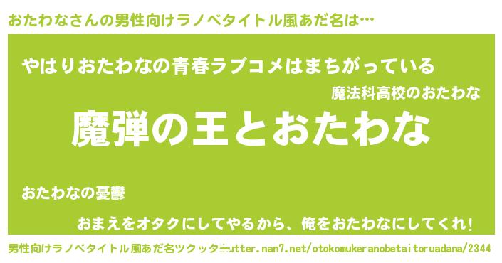 | 女子向けラノベタイトル風あだ名 | 『おたわなが死なない童話 林檎のおたわなの診療簿』 |