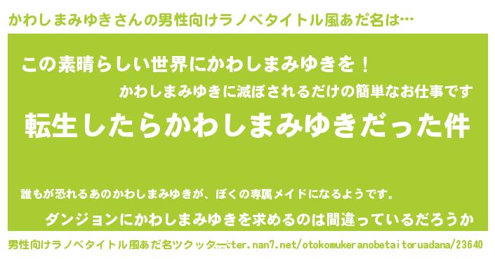 | 女子向けラノベタイトル風あだ名 | 『かわしまみゆきの玉の輿計画!』 |