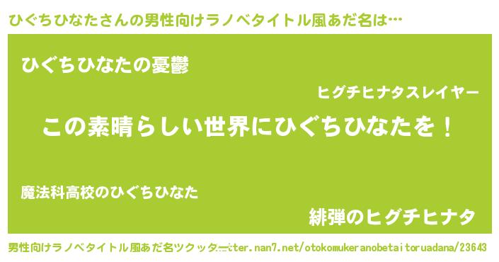 | 女子向けラノベタイトル風あだ名 | 『乙女ゲームの破滅フラグしかない悪役ひぐちひなたに転生してしまった…』 |