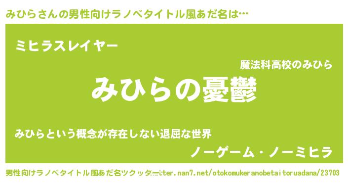 | 女子向けラノベタイトル風あだ名 | 『(仮)みひらのやんごとなき事情』 |