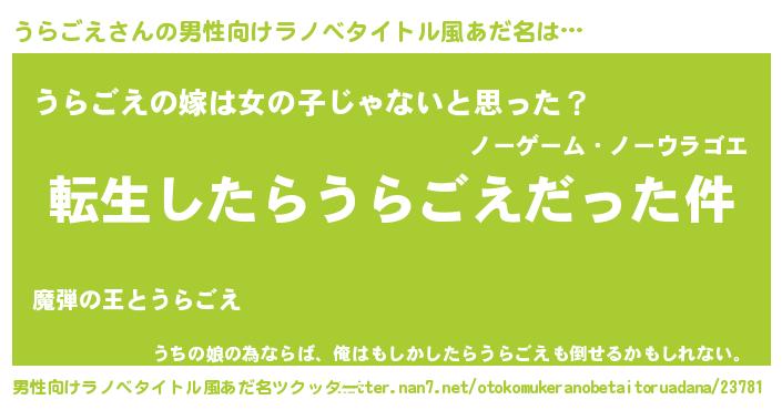 | 女子向けラノベタイトル風あだ名 | 『うらごえの玉の輿計画!』 |