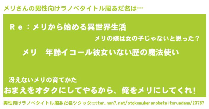 | 女子向けラノベタイトル風あだ名 | 『メリの玉の輿計画!』『闇のメリ』 |