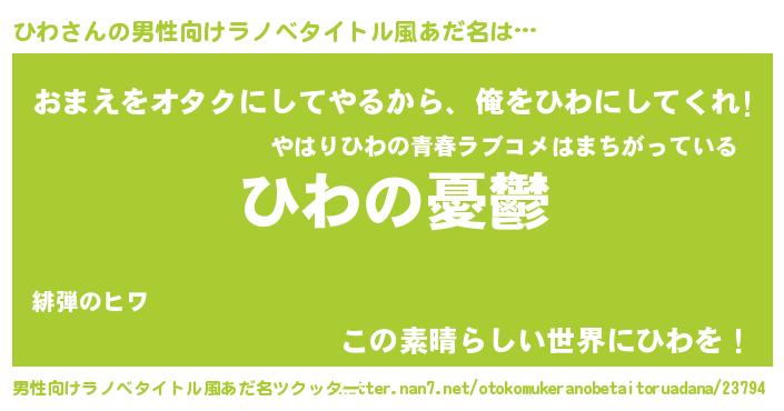 | 女子向けラノベタイトル風あだ名 | 『(仮)ひわのやんごとなき事情』 |