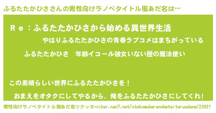 | 女子向けラノベタイトル風あだ名 | 『ふるたたかひさの玉の輿計画!』 |
