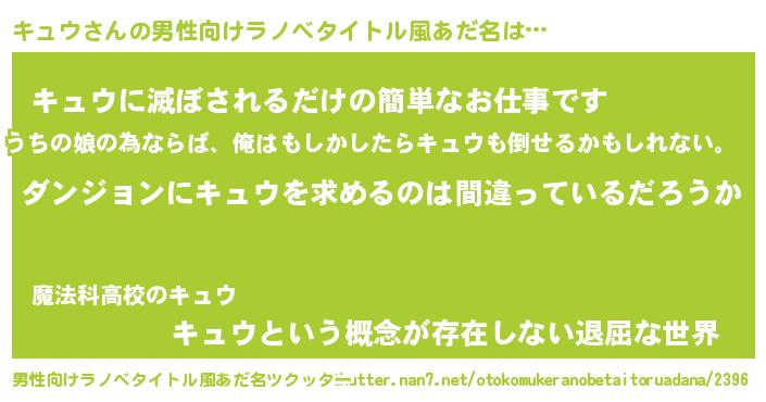 | 胡散臭い通販商品みたいなあだ名 | 『信頼と実績のサプリメント…その名も「キュウ」』 |
