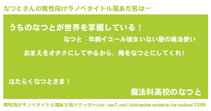 | 女子向けラノベタイトル風あだ名 | 『なつと夫妻のなれそめ』 |