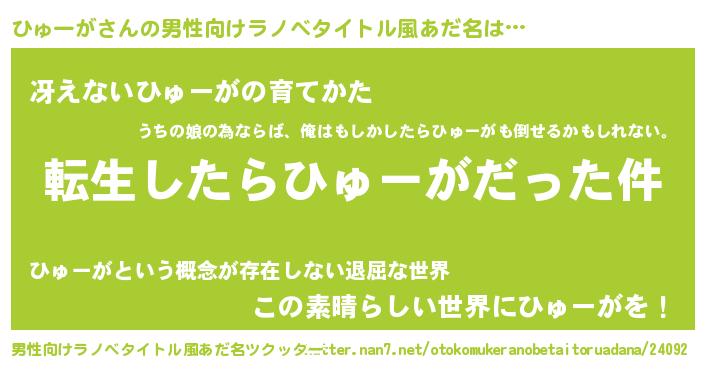 | 胡散臭い通販商品みたいなあだ名 | 『世界中を虜にした100年もののヴィンテージワイン…その名も「ひゅーが」』 |