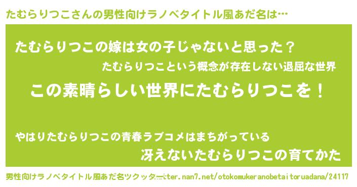 | 女子向けラノベタイトル風あだ名 | 『乙女ゲームの破滅フラグしかない悪役たむらりつこに転生してしまった…』 |