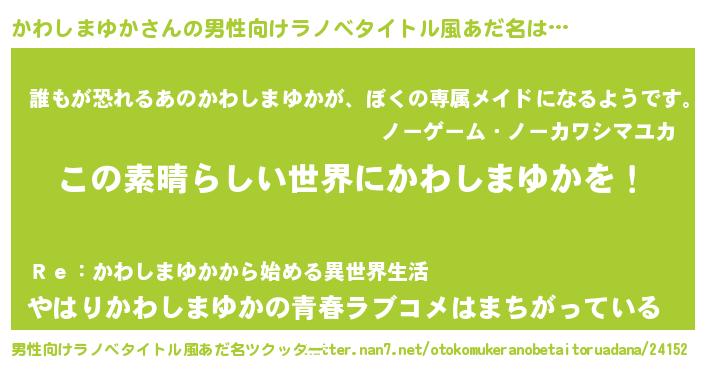 | 女子向けラノベタイトル風あだ名 | 『乙女ゲームの破滅フラグしかない悪役かわしまゆかに転生してしまった…』 |