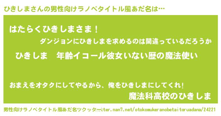 | 女子向けラノベタイトル風あだ名 | 『ひきしまの玉の輿計画!』 |