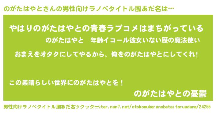 | 女子向けラノベタイトル風あだ名 | 『のがたはやと恋絵巻』 |