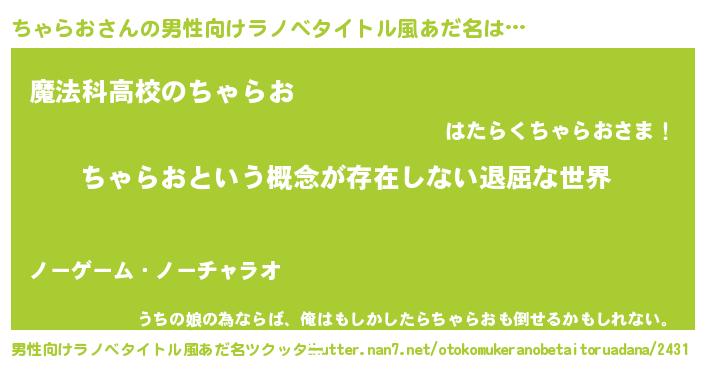 | 女子向けラノベタイトル風あだ名 | 『異世界で失敗しない100のちゃらお』 |