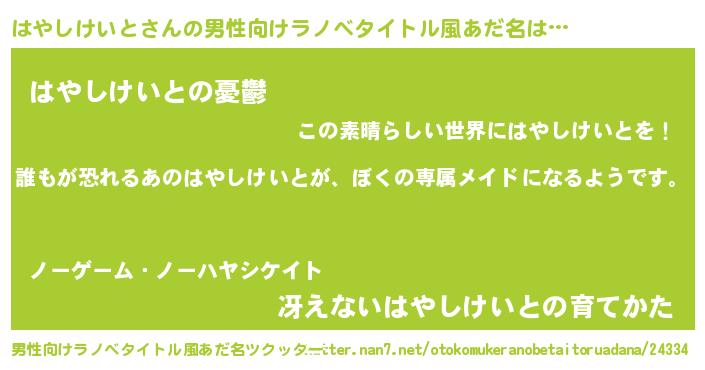 | 女子向けラノベタイトル風あだ名 | 『異世界でカフェはやしけいとを開店しました。』 |