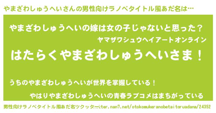 | 胡散臭い通販商品みたいなあだ名 | 『信頼と実績のサプリメント…その名も「やまざわしゅうへい」』 |