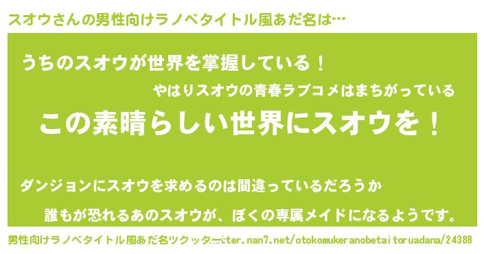 | 胡散臭い通販商品みたいなあだ名 | 『世界中を虜にした100年もののヴィンテージワイン…その名も「スオウ」』 |