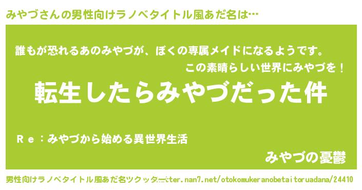 | 女子向けラノベタイトル風あだ名 | 『みやづの玉の輿計画!』 |