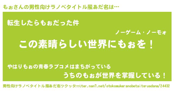 | 女子向けラノベタイトル風あだ名 | 『悪役もぉに転生したようですが、知った事ではありません』 |