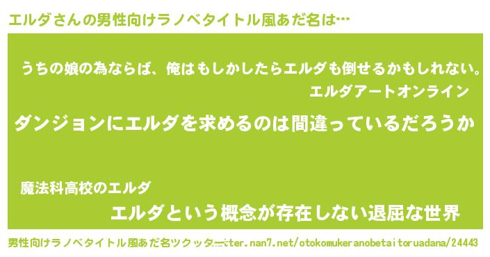 | 女子向けラノベタイトル風あだ名 | 『エルダの卵を拾いまして』 |