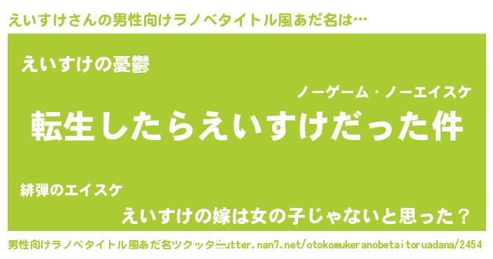 | 女子向けラノベタイトル風あだ名 | 『婚約破棄系悪役えいすけに転生したので、保身に走りました。』 |