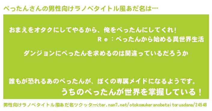 | 女子向けラノベタイトル風あだ名 | 『ぺったんの卵を拾いまして』 |