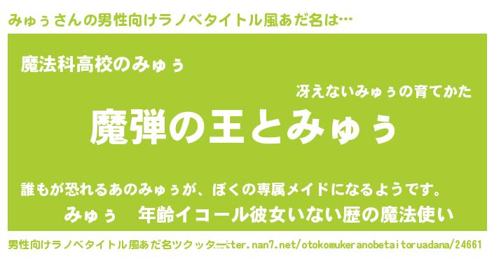 | 女子向けラノベタイトル風あだ名 | 『乙女ゲームの破滅フラグしかない悪役みゅぅに転生してしまった…』 |